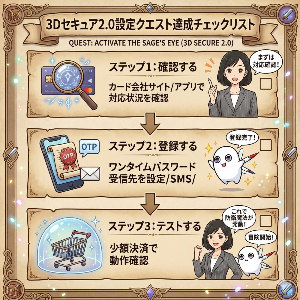 結論から言えば、あなたの「武具店」(カード会社)のサイトやアプリで、ワンタイムパスワードの受信設定を済ませれば大丈夫だ。この記事では、その手順を3ステップで解説します。